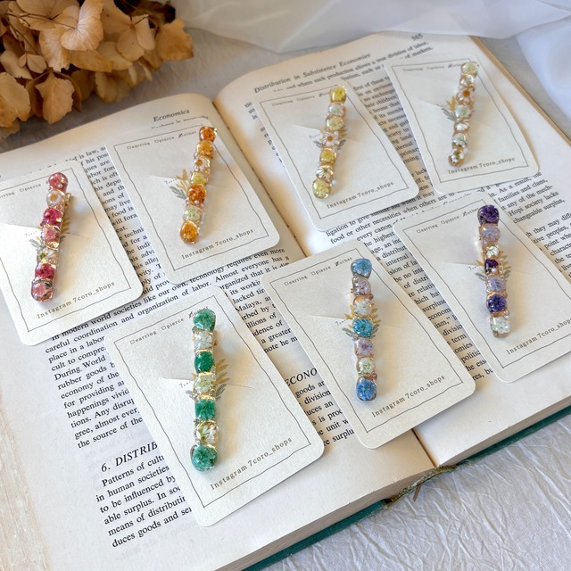本物のお花を使った つぶつぶ感がかわいいヘアクリップです✨ 1粒1粒組み合わせ作った一点物! カラバリも豊富にご用意しました✨ お気に入りが見つかりますように。 サイズ:約6.5cm×約0.9cm 重さ:約5g ┈┈┈┈┈┈┈┈┈┈┈┈┈┈┈┈┈┈┈┈ イヤリングの素材は真鍮ですが、「ニッケルフリーメッキ」が施されている為、金属アレルギーが出てしまう人も安心して着けることができます。 ピアスは医療用器具にも使われる、人体に優しい「サージカルステンレス」を使用し、「ニッケルフリーメッキ」処理を施しております。サビや変色に強く、金属アレルギーが出てしまう人も安心して着けることができます。 一つ一つ心を込めて作っていますので、多少のずれや歪みなどはご理解お願い致します。 本物のお花を使っているため、 お花の大きさや形が個体差があります。 一つ一つ手作りなのでお花の入り方も少し異なる場合がございますが、予めご了承ください。 ┈┈┈┈┈┈┈┈┈┈┈┈┈┈┈┈┈┈┈┈