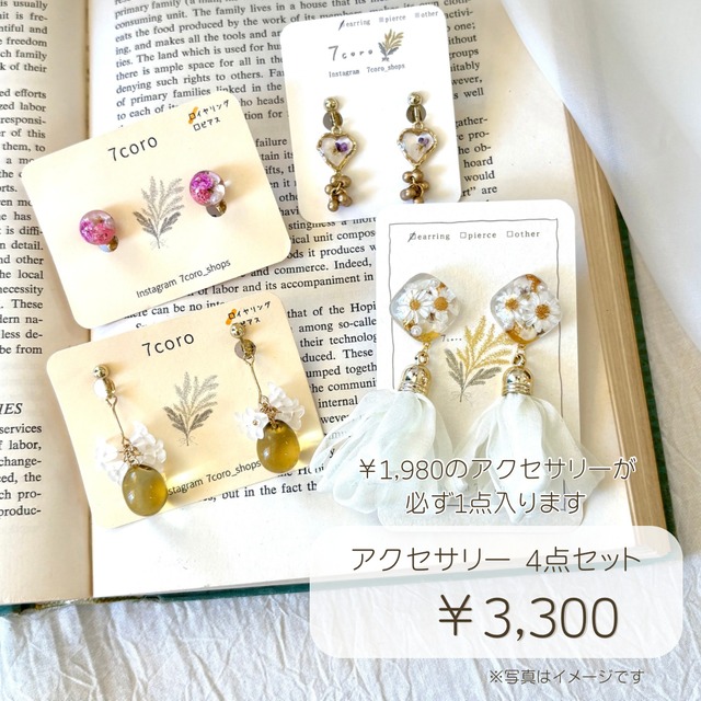 年に一度の福袋販売✨ とってもお得なセットです! アクセサリーが4点入ったセットです! ※ このセットには¥1,980のアクセサリーが必ず1点入ります ピアスとイヤリングは、どちらがいいか選択して頂けます! ご購入の際に選択をお願い致します。 ピアスとイヤリングの混合は出来ませんのでご了承ください。 イヤリングやピアス以外に ネックレスやヘアクリップなど他のアクセサリーも 入る場合がございます。 必ずお答えできるかは分かりませんが、 すでに持っているものがある方や 使わないから入れないでなど もしご希望ございましたらご購入の際に 備考欄に記入をお願いいたします。 -発送について- 12月24日から12月27日までのご注文は、 28日までに随時発送させて頂きます。 12月29日から1月2日までのご注文は、 お休み期間になりますので1月3日から随時発送させて頂きます。 ┈┈┈┈┈┈┈┈┈┈┈┈┈┈┈┈┈┈┈┈ イヤリングの素材は真鍮ですが、「ニッケルフリーメッキ」が施されている為、金属アレルギーが出てしまう人も安心して着けることができます。 ピアスは医療用器具にも使われる、人体に優しい「サージカルステンレス」を使用し、「ニッケルフリーメッキ」処理を施しております。サビや変色に強く、金属アレルギーが出てしまう人も安心して着けることができます。 一つ一つ心を込めて作っていますので、多少のずれや歪みなどはご理解お願い致します。 ┈┈┈┈┈┈┈┈┈┈┈┈┈┈┈┈┈┈┈┈