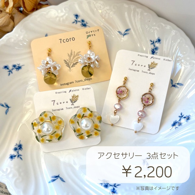 年に一度の福袋販売✨ アクセサリーが3点入ったセットです! ピアスとイヤリングは、どちらがいいか選択して頂けます! ご購入の際に選択をお願い致します。 ピアスとイヤリングの混合は出来ませんのでご了承ください。 イヤリングやピアス以外に ネックレスやヘアクリップなど他のアクセサリーも 入る場合がございます。 必ずお答えできるかは分かりませんが、 すでに持っているものがある方や 使わないから入れないでなど もしご希望ございましたらご購入の際に 備考欄に記入をお願いいたします。 -発送について- 12月24日から12月27日までのご注文は、 28日までに随時発送させて頂きます。 12月29日から1月2日までのご注文は、 お休み期間になりますので1月3日から随時発送させて頂きます。 ┈┈┈┈┈┈┈┈┈┈┈┈┈┈┈┈┈┈┈┈ イヤリングの素材は真鍮ですが、「ニッケルフリーメッキ」が施されている為、金属アレルギーが出てしまう人も安心して着けることができます。 ピアスは医療用器具にも使われる、人体に優しい「サージカルステンレス」を使用し、「ニッケルフリーメッキ」処理を施しております。サビや変色に強く、金属アレルギーが出てしまう人も安心して着けることができます。 一つ一つ心を込めて作っていますので、多少のずれや歪みなどはご理解お願い致します。 ┈┈┈┈┈┈┈┈┈┈┈┈┈┈┈┈┈┈┈┈